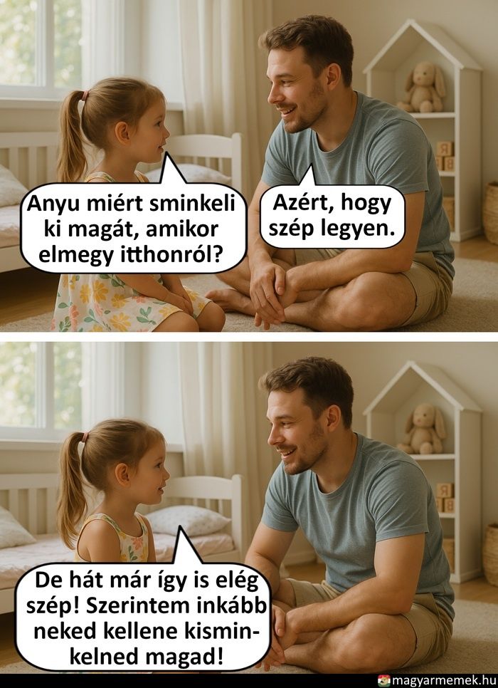 A kislányom, miközben még közelebb hajolt hozzám: De azért remélem, hogy nekem sosem lesznek olyan nagy ráncok a szemem alatt, mint neked.