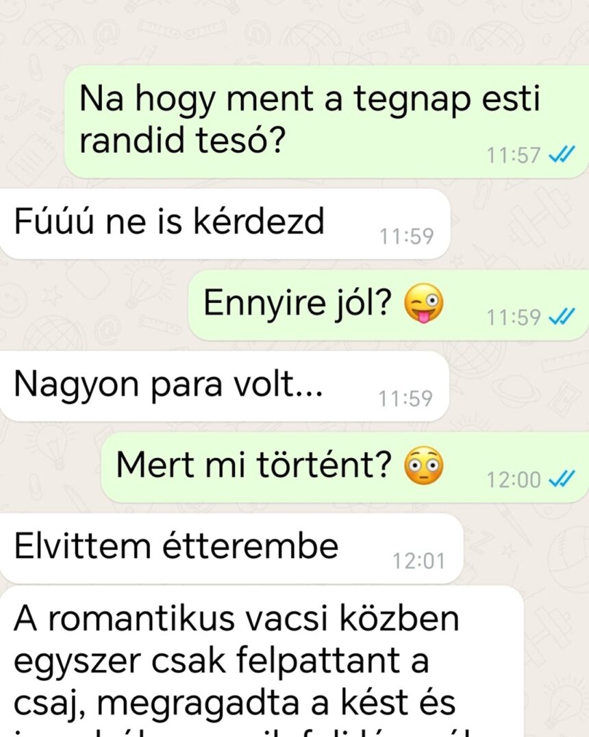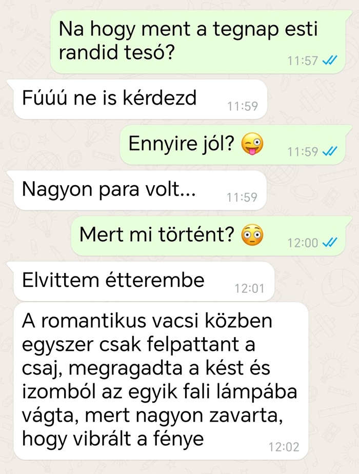 A vacsora alatt én megittam két ásványvizet, míg ő drágábbnál drágább italokat kért ki magának. Amikor kihozták a számlát, rám nézett és teljesen komolyan azt mondta, hogy szerinte úgy lenne fair, ha felesben fizetnénk.