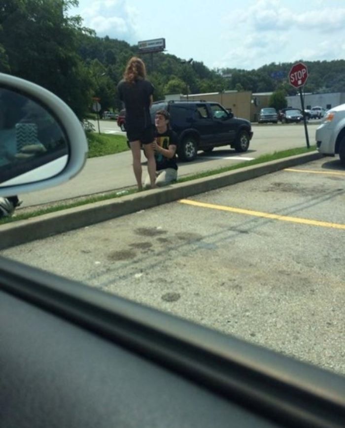 (9) A srác feltehetőleg “sokat” agyalhatott azon, hogy hol kérje meg a barátnője kezét. Végül egy szemetes parkolóra esett a választása.