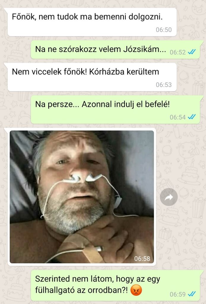 Egy forró nyári napon nagyon nem volt kedvem bemenni dolgozni, ezért betelefonáltam a munkahelyemre, és azt mondtam, hogy beteg vagyok. Ezután vidáman kimentem a strandra, ahol viszont hamar az arcomra fagyott a mosoly, ugyanis összefutottam az egyik diákommal. Kiderült, hogy mindketten lógunk az órámról.