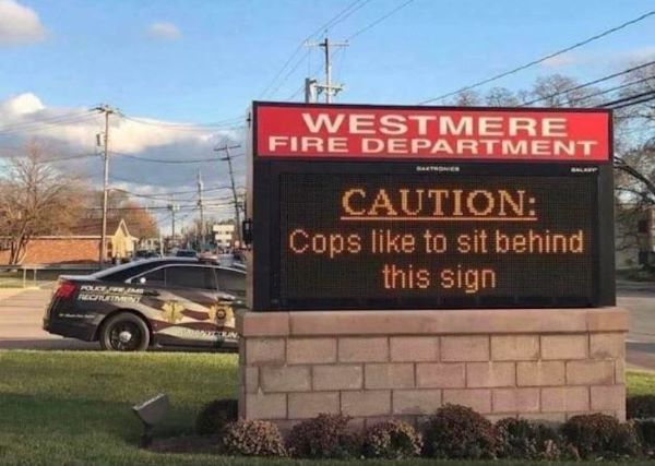 (4) A tűzoltó-parancsnokság épülete előtti digitális tájékoztató táblára kiírták a tűzoltók, hogy a rendőrök szeretnek a tábla mögött rejtőzni.
