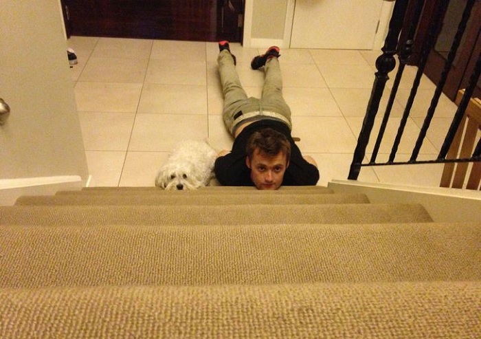 9. Este vendégségbe mentünk a barátainkhoz, a férjem és a kutyánk pedig így vártak rám a földszinten, hogy végre elkészüljek: