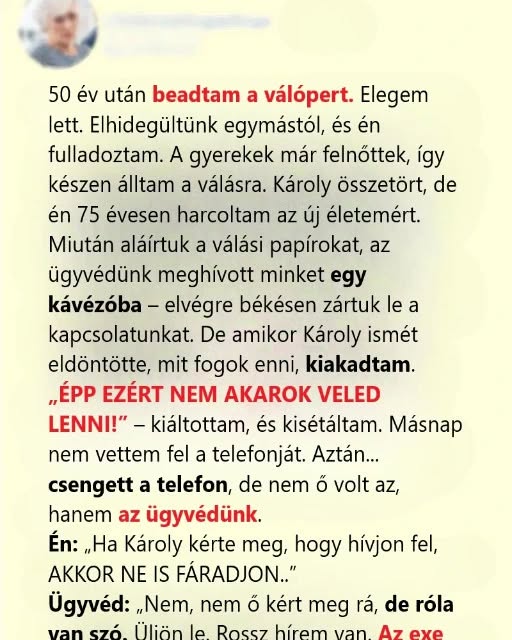 Ötven év házasság után beadtam a válókeresetet. Elegem lett. Eltávolodtunk egymástól, úgy éreztem, megfulladok. A gyerekek már felnőttek, nem szorultak ránk, én pedig kész voltam kilépni. Károly összeomlott, amikor közöltem vele a döntésemet, de én, 75 évesen, a saját új életemért harcoltam.