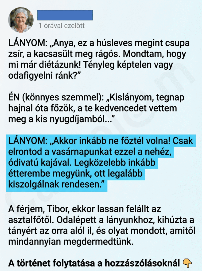 A férjem addig egyetlen szót sem szólt. Némán hallgatta a lánya méltatlankodását, aztán lassan letette a villát, és felállt az asztalfőtől. Az arca olyan volt, mint a vihar előtti csend. Odalépett Szilvia mellé, és egy határozott mozdulattal kihúzta a teli tányért az orra alól.
