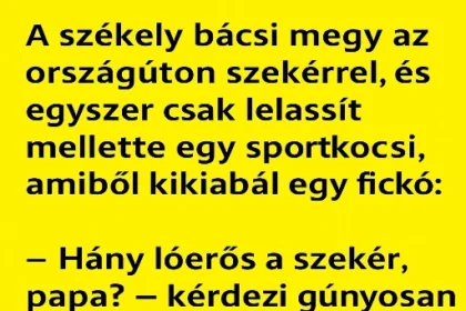 Vicc: A székely bácsi megy az országúton szekérrel, és lelassít mellette egy sportkocsi