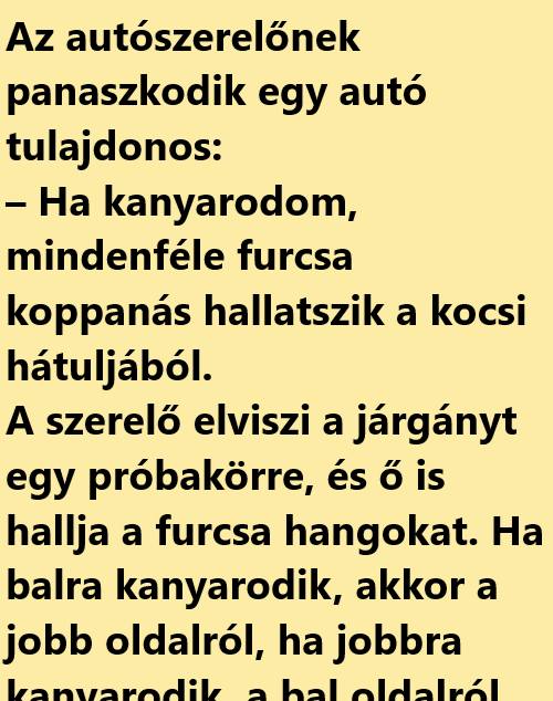 Az autószerelőnek panaszkodik egy autó tulajdonos: – Ha kanyarodom, mindenféle furcsa koppanás…