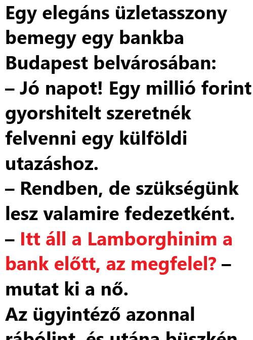 Egy elegáns üzletasszony bemegy egy bankba Budapest belvárosában: – Jó napot! Egy…