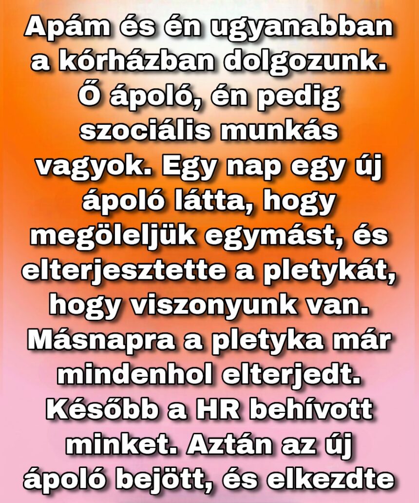 Ami komoly kárt is okozhatott volna, végül egy emlékezetes munkahelyi lecke lett. A feltételezések gyorsan el tudják torzítani a valóságot, ezért érdemes megállni egy pillanatra, mielőtt elhiszünk vagy továbbadunk egy történetet. Egy kórház nemcsak a betegeknek kell hogy a gondoskodás helye legyen, hanem azoknak is, akik ott dolgoznak. Nekem ez az eset még egy dolgot megerősített, büszke vagyok, hogy apámmal egy helyen dolgozom, és a türelem, az őszinteség, valamint a tiszta beszéd még a legváratlanabb félreértést is helyre tudja tenni.