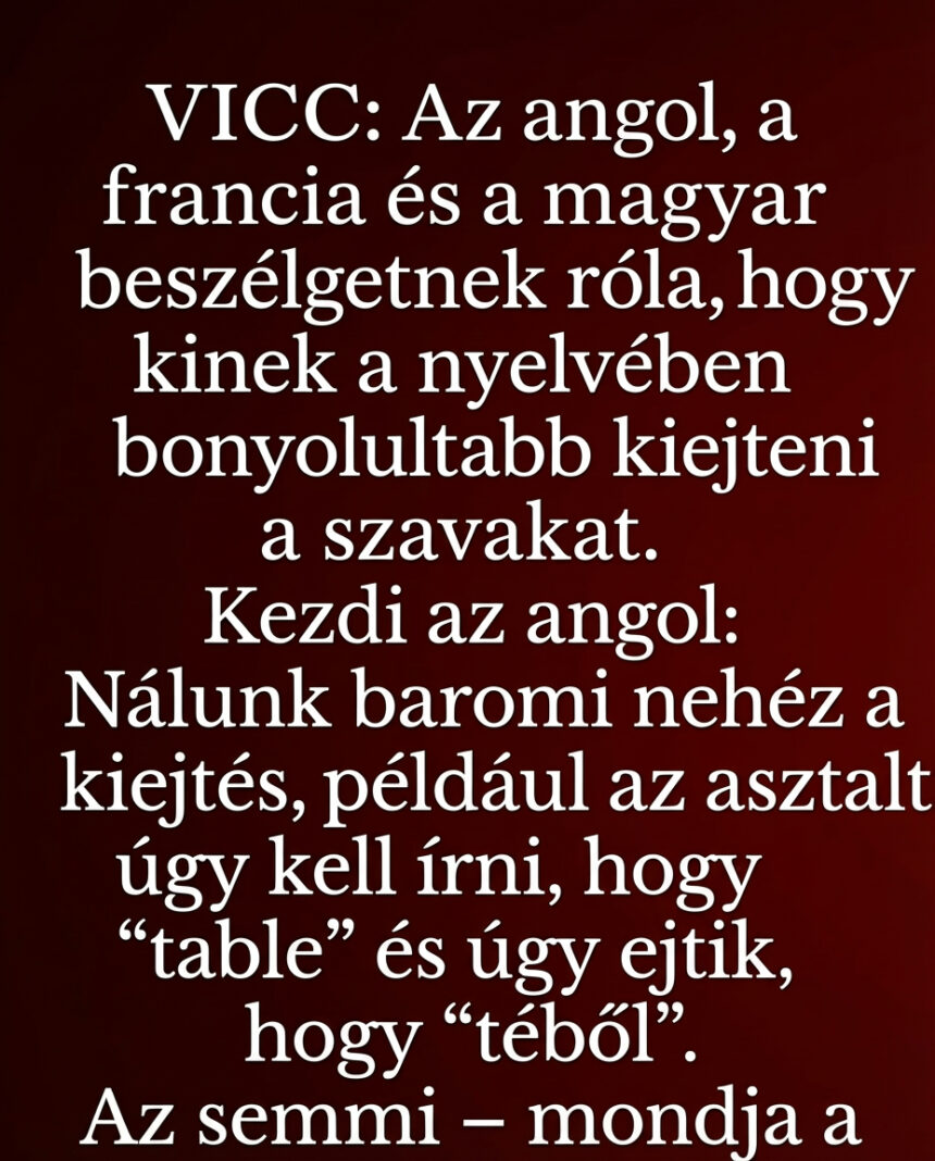 Az angol, a francia és a magyar beszélgetnek róla, hogy kinek a nyelvében bonyolultabb kiejteni a szavakat.