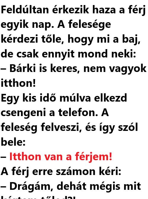 Feldúltan érkezik haza a férj egyik nap. A felesége kérdezi tőle, hogy mi a baj, de csak ennyit mond neki: