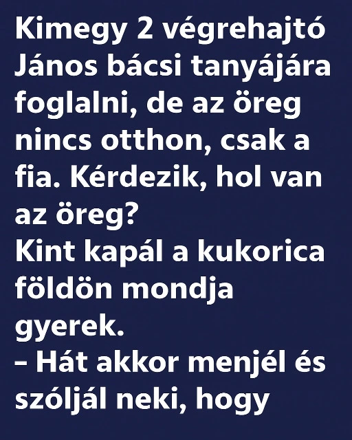 Kimegy 2 végrehajtó János bácsi tanyájára foglalni, de az öreg nincs otthon, csak a fia. Kérdezik, hol van az öreg?